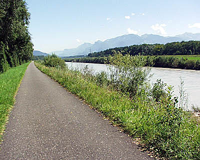 minimal ansteigend direkt auf dem Rheindamm. Die Fahrbahnoberfläche