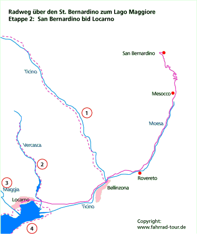(Seitenanfang) Entfernungen: -> Bellinzona: 31,0 km, <- San Bernardino: 14,0 km, ->O Ziel: 60,5 km, O<- Ausgangspunkt: 14,0 km Der Radweg zweigt bei Mesocco auf einen Wirtschaftsweg ab. Weitab vom Verkehr radelten wir durch Felder an der Moesa entlang.