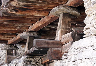 Neben der alten Steinkirche finden Sie eine alte Scheune, deren Fundament aus Bruchsteinen besteht. Die Scheune selbst ist ein Holzfachwerkbau, der auf Steinscheiben ruht, die wieder von Holzständern aufgestützt werden. Klar?