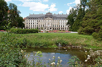 Das fürstliche Schloss in Donaueschingen. Nach Rechts erstreckt sich ein riesiger Park.