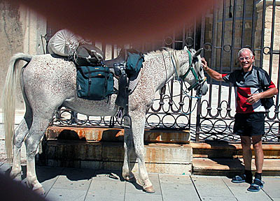 15. August 2004, KM-Stand ab 1837 Km, KM-Stand an 1896 Km Heute fuhren wir nach Meinung von meinem Freund Mariano, die schönste und wohl auch leichteste Strecke unserer Pilgerreise. Mit 59 Kilometer war sie von der Strecke her relativ kurz. Mit 4 Stunden Dauer von der Zeit her die bisher kürzeste. Wir hatten in Leon im Hostal Evagar für 28 Euro Zimmer bestellt, da wir diese schöne Stadt in Ruhe anschauen wollten. Von Sahagun aus fuhren wir cirka 40 Kilometer auf dem sogenannten „Real Camino“. Das ist eine vom spanischen Landwirtschaftsministerium gesponserte Strecke, die Abseits von Autobahn und anderen Straßen den Pilgern vorbehalten ist. Die Radpilger fahren auf einer asphaltierten Straße daneben. So kommt es am laufenden Band zu Begegnungen mit dem Gruß Buen Camino und Ultreja. Diesen cirka 40 Km langen Abschnitt des Camino nennt man scherzhaft auch die „Pilgerautobahn“. Die angepflanzten Bäume sind leider noch sehr klein und werfen daher wenig Schatten. Die Temperaturen lagen bei cirka 30 Grad im nicht vorhandenen Schatten. Vor Mansilla de las Mulas befuhren wir ein Stück des Pilgerweges der nicht asphaltiert sondern naturbelassen war. Hier gab es viele Steine und Schlaglöcher. Die letzten 20 Kilometer bis nach Leon stieg die Strecke noch einmal an, so dass wir uns doch noch einmal anstrengen mussten. Wir besichtigen nach der Ankunft die Kathedrale und besorgten uns den Pilgerstempel in der Sakristei. Vor der Kathedrale sahen wir zum ersten Mal einen „Pferdepilger“, besser gesagt nur das Pferd, das dort angebunden war.