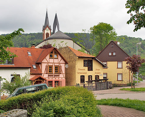 Schon am Ortseingang bemerkt man die interessanten Häuser in Neckargerach. Am Ortseingang liegt die Kirche auf einem Hügel, der zweite Turm ist in modernem Stil erbaut.