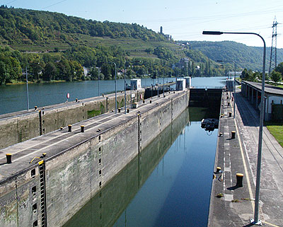 Die Staustufe müssen Sie über die stählernen Treppen überqueren. Die zahlreichen Staustufen sollen den Höhenunterschied des Neckars mildern und schiffbarer machen. Gleichzeitig wird über Turbinen Strom erzeugt.
