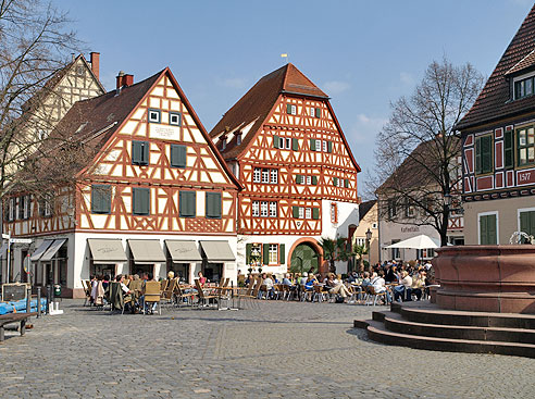 Wunderschön erhaltene Fachwerkhäuser schmücken den Marktplatz von Ladenburg.