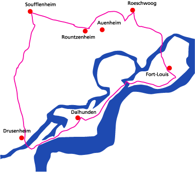 (Seitenanfang) Entfernungen: -> Soufflenheim: 4,5 km, <- Auenheim: 1,0 km, Am Ortsanfang überqueren Sie eine Bahnlinie und durchqueren anschließend den Ort auf der Durchgangsstraße. Kurz nach dem Ort überqueren Sie die Autobahn A35 auf einer Brücke und radeln dann auf dem Radweg, der auf der Straße N63 markiert ist, weiter auf die angrenzenden Wälder zu. Nach kurzer Zeit erreichen Sie den Ortseingang von Soufflenheim. |