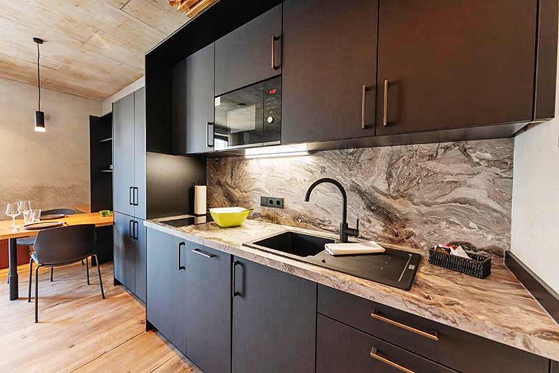 Sie sind - ideal für Selbstversorger - mit kompletten Küchen, Geschirr, Besteck, Kochutensilien ausgestattet und besitzen einen möblierten Essbereich.