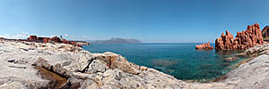 Ausblick auf die bekannten roten Felsen von Arbatax und die weitläufuge Bucht. |