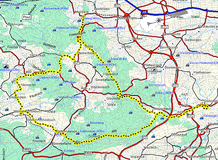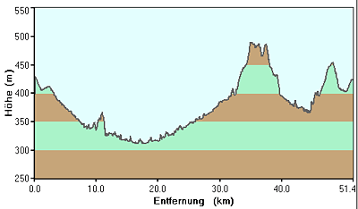 Nach etwa acht Kilometern, immer entlang an dem kleinen Reichenbach, erreichen Sie bei der Burkhardtsmühle einen Erfrischungsstand. Kurz danach führt eine Holzbrücke über die Straße und führt auf die rechte Seite des Flusses "Aich". Ein gewalzter Radweg folgt nun im wesentlichen dem kleinen Fluss in Richtung Neuenhaus. Nicht ganz so eben wie erwartet erreichen Sie eine Anhöhe vor dem Ort, radeln in den Ortskern von Neuenhaus und bewundern die markante Kirche und das Rathaus. Damit der kulturelle Durst noch etwas mehr gestillt wird, radeln wir entlang der Aich weiter über Aich bis nach Grötzingen.