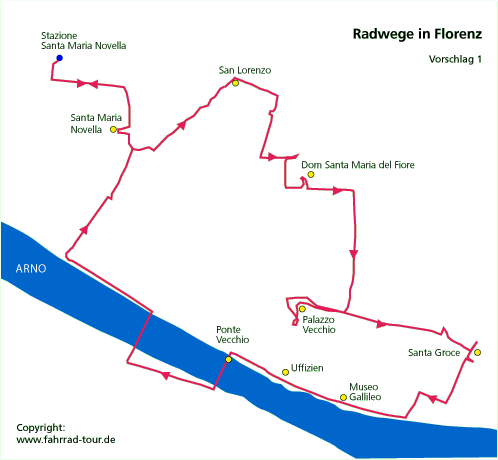 Florenz nördlich des Arno - durch die AltstadtDiese Radtour beginnt am Bahnhof "Santa Maria Novella". Die Kirche "Santa Maria Novella" steht auf der rechten Seite des fünfeckigen Platzes, den viele als Sonnenplatz nutzen und sich auf dem kleinen Stück Rasen zwischen den Obelisken lümmeln.