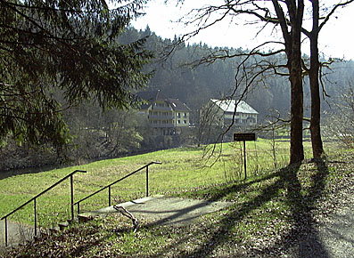 Der Radweg führt längere Strecken direkt im Wald. Wohltuend sind die "lichten" Stellen mit schönen Blicken auf das idyllische Tal, zumal hier der Blick auf eine kulinarische Erholungsstelle fällt.