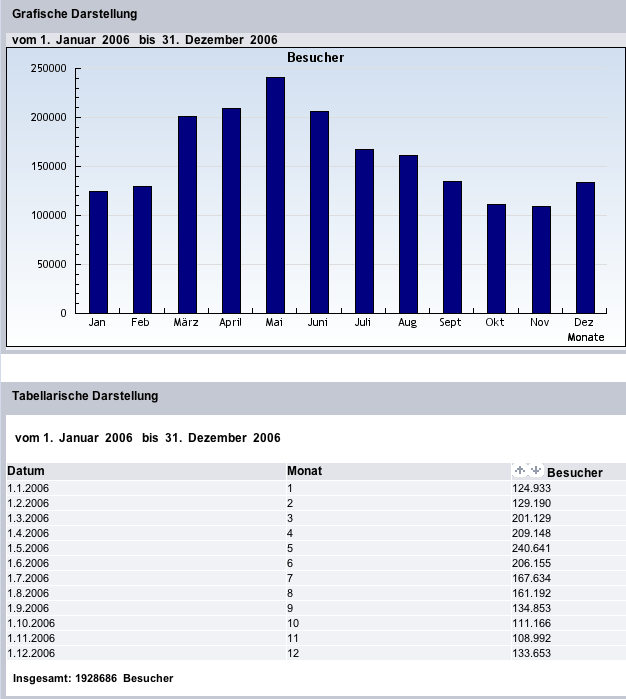 Im Jahre 2006 konnten wir 1.928.686 Gäste auf unseren Seiten registrieren, die insgesamt 8.202.425 Seiten abgerufen haben. |