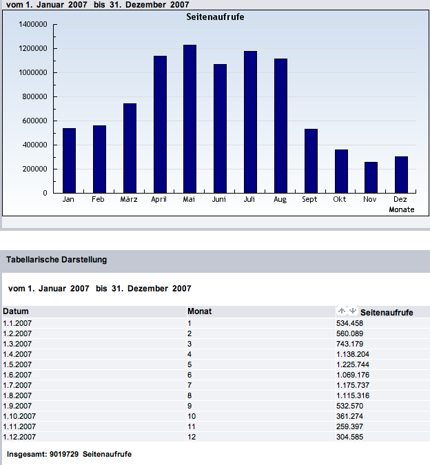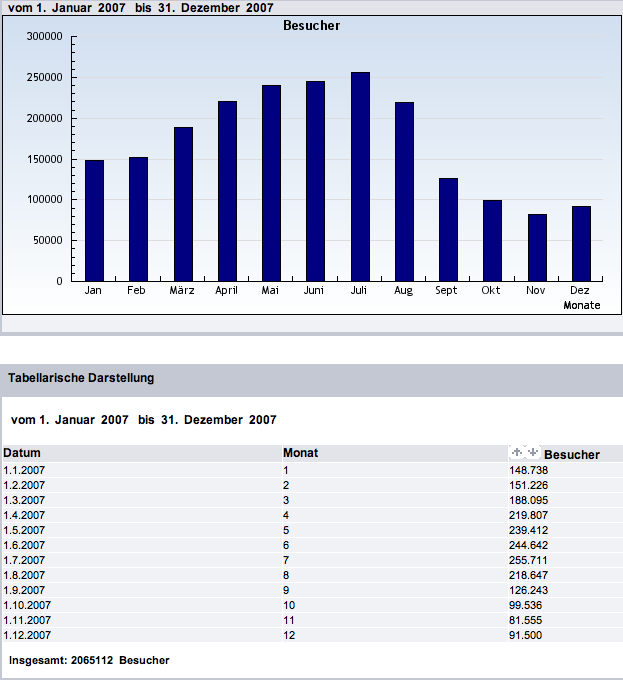 Im Jahre 2007 konnten wir 2.065.112 Gäste auf unseren Seiten registrieren, die insgesamt 9.019.729 Seiten abgerufen haben. |