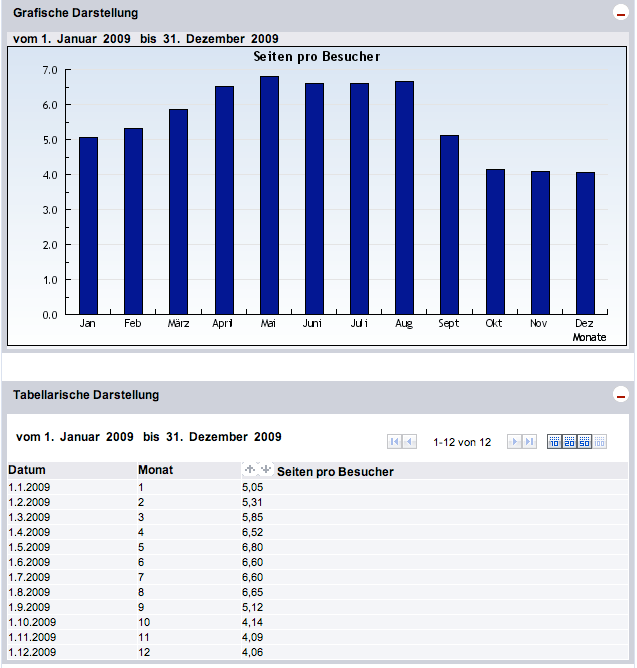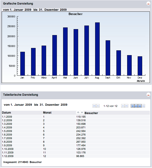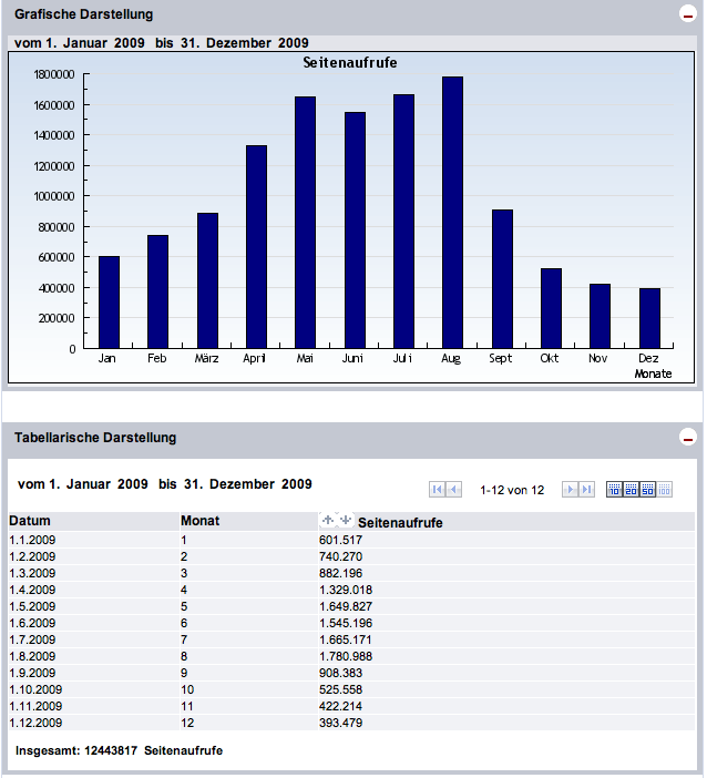 Im Jahre 2009 konnten wir 2.114.943 Gäste (Visits) auf unseren Seiten registrieren, die insgesamt 12.443.817 Seiten abgerufen haben. |