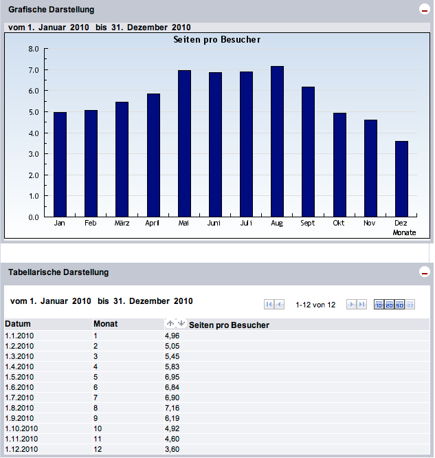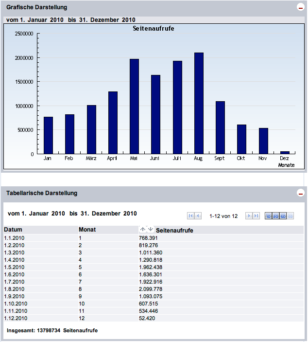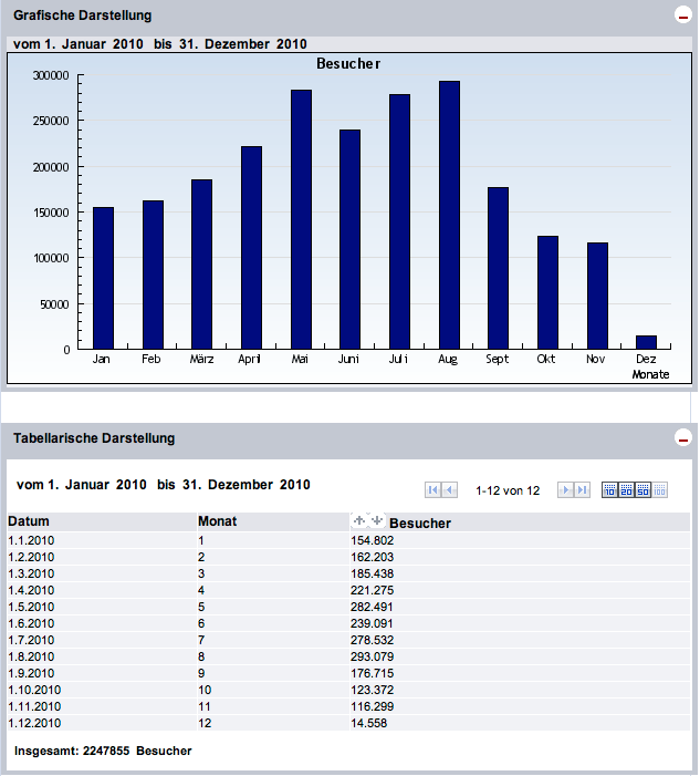 Im Jahre 2010 (bis 4.12.2010) konnten wir 2.247.855 Gäste (Visits) auf unseren Seiten registrieren, die insgesamt 13.798.734 Seiten abgerufen haben. |